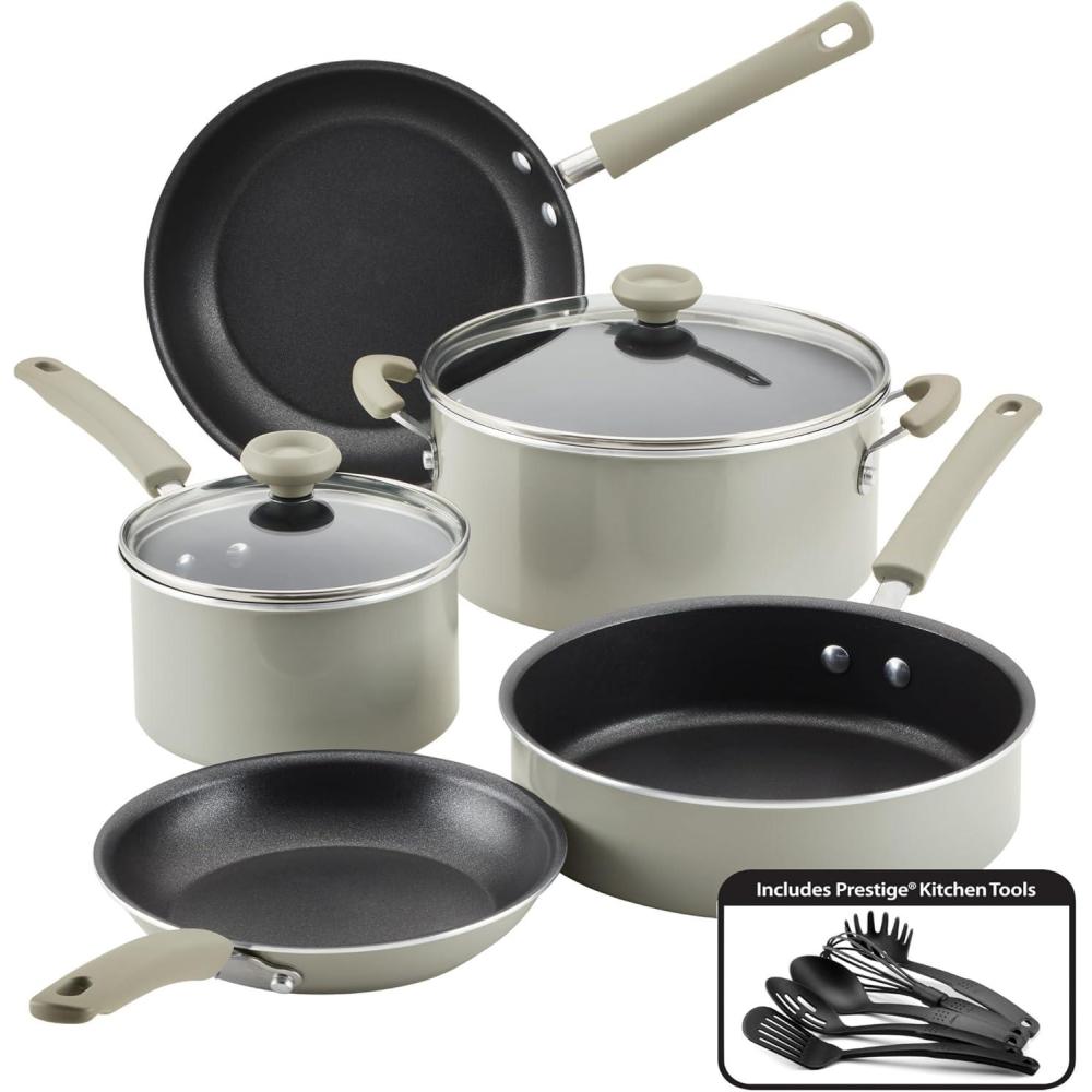 WHAT'S INSIDE: 2-quart saucepan with lid, 5-quart dutch oven, 3-quart saute pan with lid (lid also fits Dutch oven!), 8.5-inch frying pan, 10-inch frying pan, and (5) Prestige kitchen utensils: slotted turner, slotted spoon, solid spoon, pasta fork, whisk