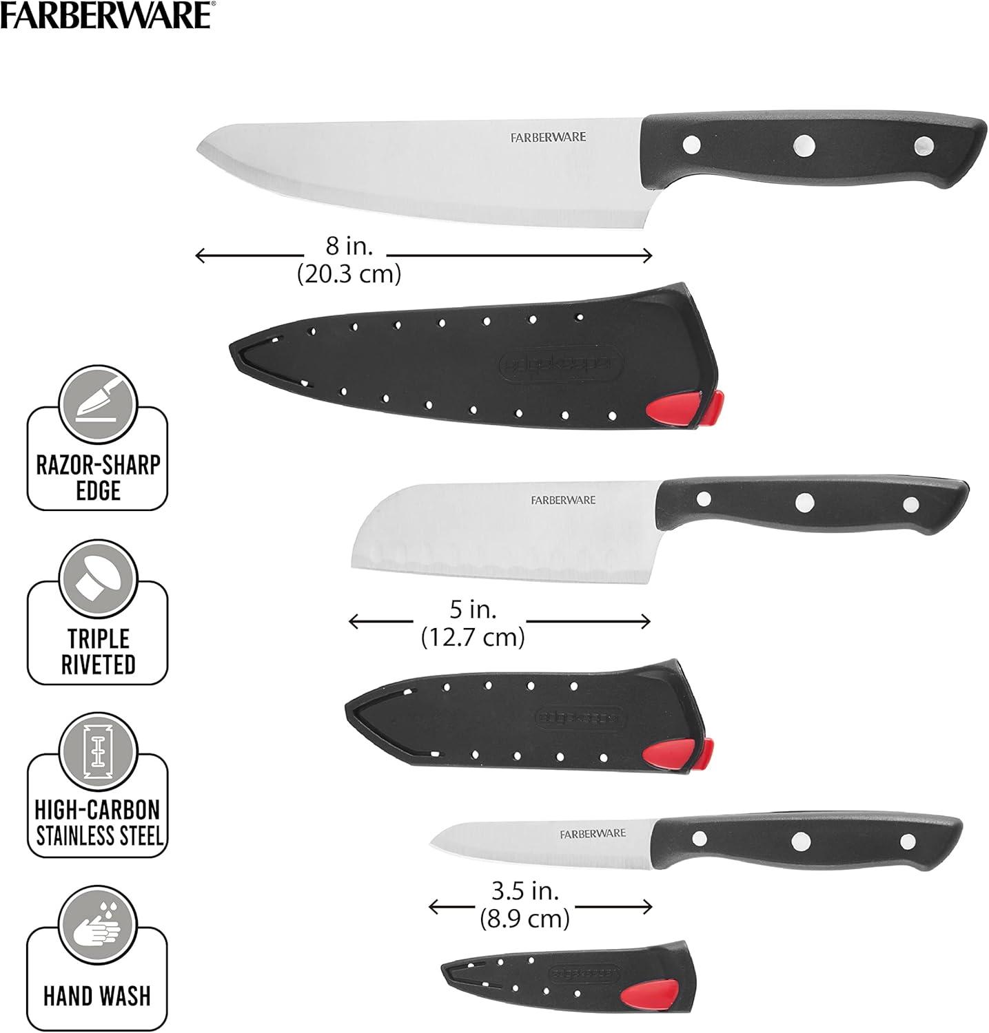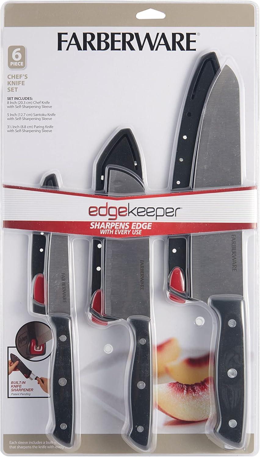 Always have the right knives on hand with this Farberware 6-Piece Self-Sharpening Triple Riveted Chef Knife Set. This set is perfect for everyday food prep tasks. The chef knife is the most versatile knife used for chopping, dicing, slicing and mincing. The santoku knife is perfect for cutting, mincing, and dicing. The paring knife is ideal for cutting and trimming small fruits and vegetables. The knives feature a high-carbon stainless steel blade and is perfectly weighed for balance and control while cutting. The knives feature a built in sharpener, which sharpens blade edge with every use. The sleeve keeps blade edge secure while knife is not in use. Includes: 8-inch chef knife with edgekeeper sharpening sheath, 5-inch santoku knife with edgekeeper sharpening sheath, 3.5 inch knife with edgekeeper sharpening sheath. Hand-wash knives with warm water and a mild detergent then rinse and dry immediately. Stainless steel knives are not dishwasher safe.