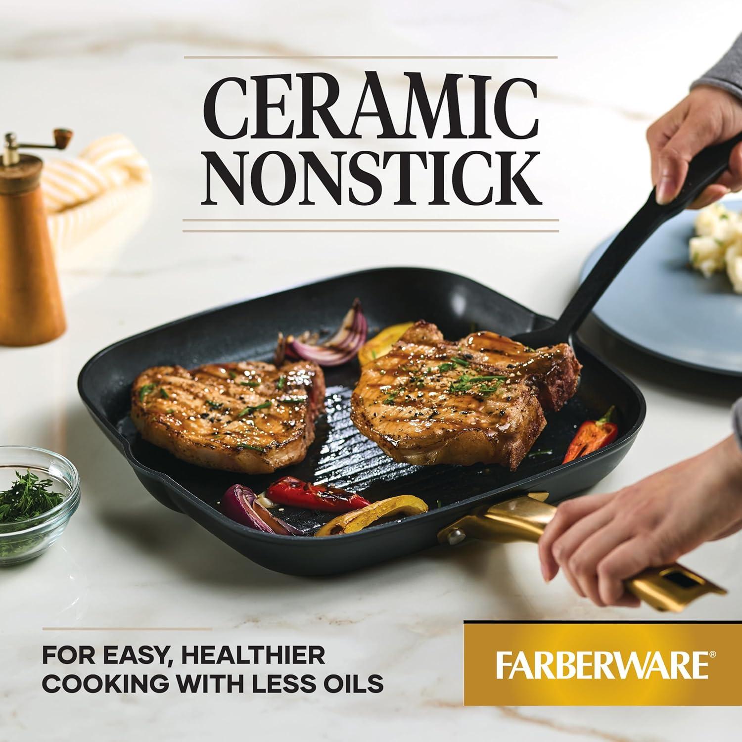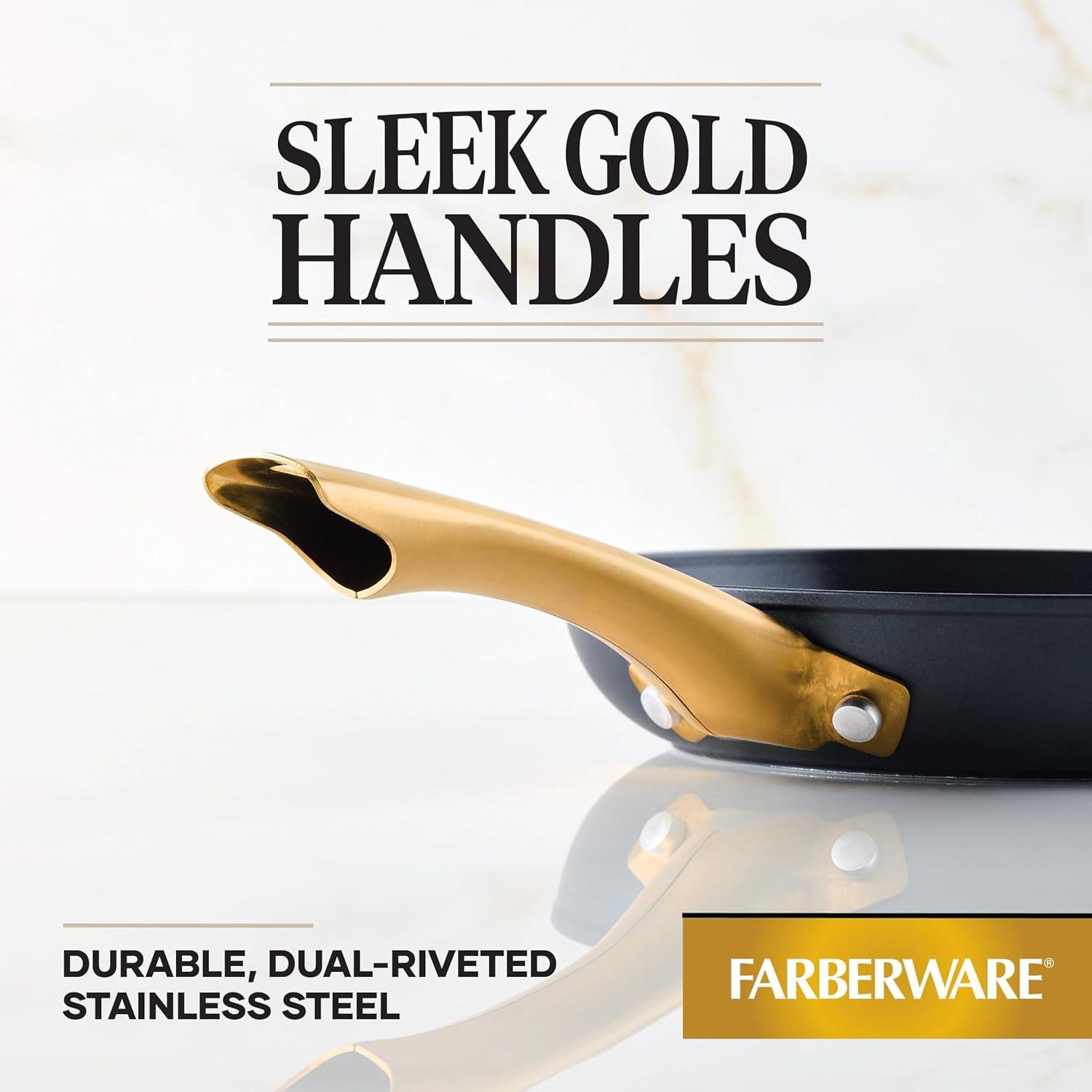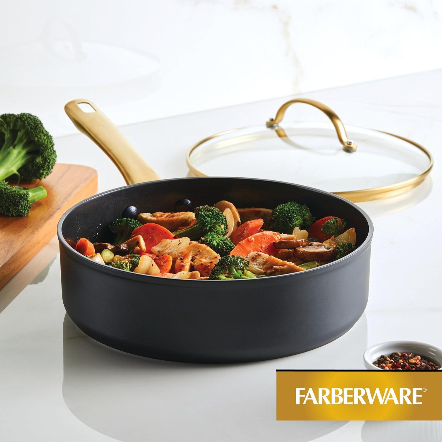Farberware’s Forged Induction collection combines high-performance ceramic nonstick with a beautiful design that looks good on any stovetop, including induction. Forged Induction features ceramic nonstick surfaces – made without PFAS, PFOA, lead, or cadmium* – so you can cook with confidence; plus, forged-aluminum construction for superior heat distribution, and edge-to-edge steel bases for enhanced durability. Plus, this 3-quart saute pan stands out in any kitchen or on any dining table with a matte-black exterior and elegant gold-colored accents. *Product design does not involve intentionally adding to the interior nonstick coating any of these substances which may otherwise be present in the environment.