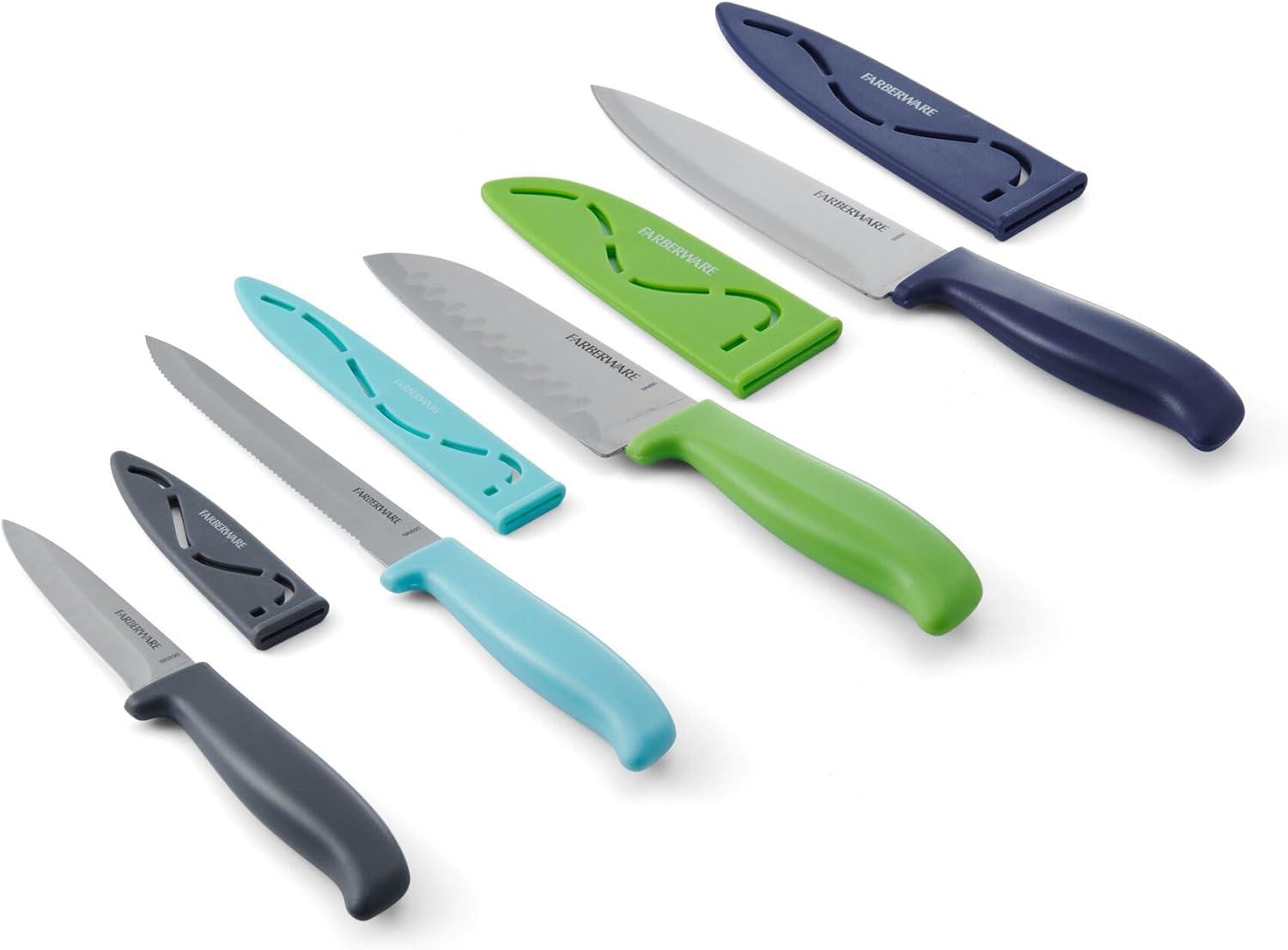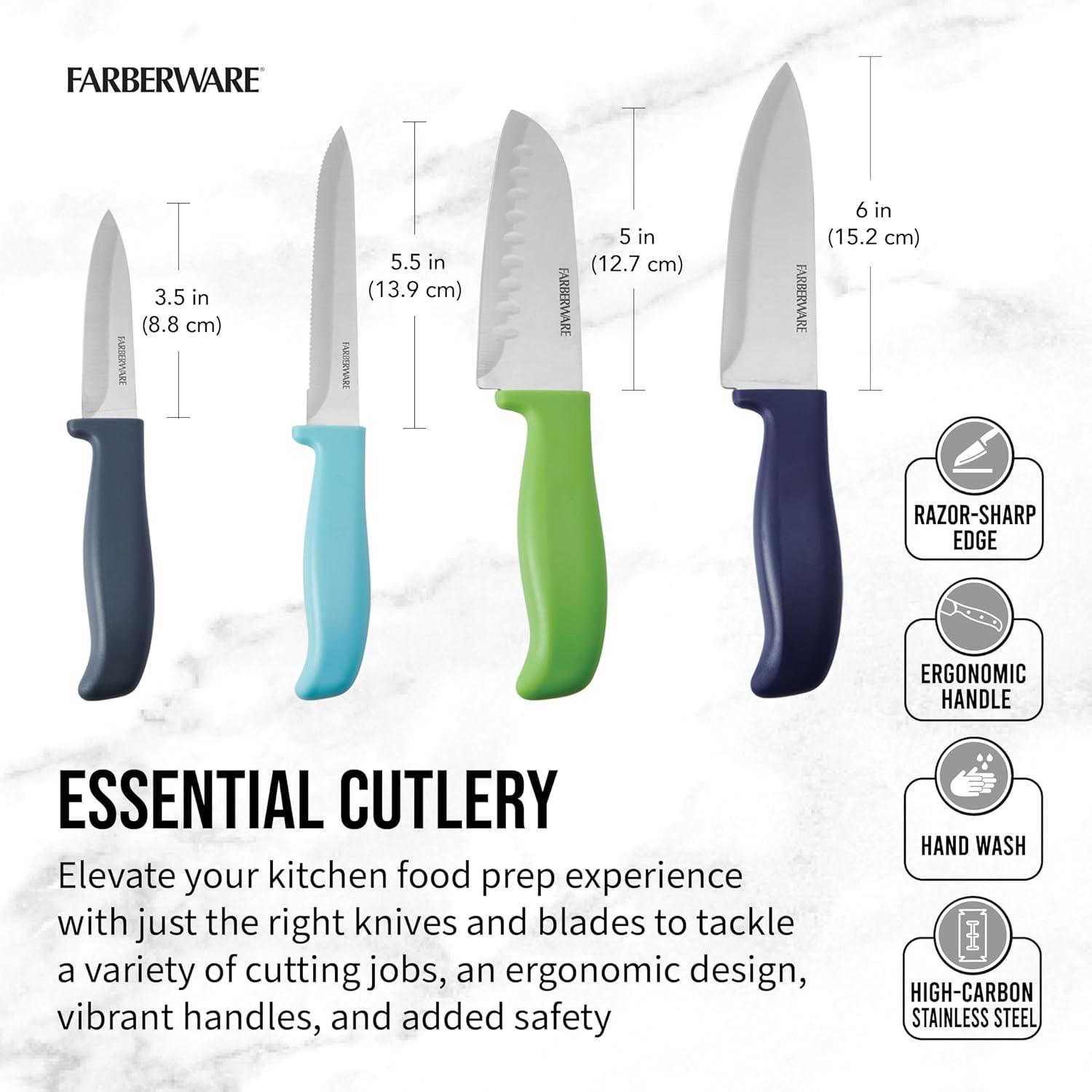 Add essential everyday knives to your kitchen while always having the right knife on hand with this Farberware 3 Piece Chef Set. This knife features a high-carbon stainless steel blade and is perfectly weighted for balance and control when cutting. It features a black polypropylene handle that is easy to hold onto when cutting.The knife blade is expertly crafted from superior quality, high-carbon stainless steel, which ensures the blades retain it's ultra-sharp edge longer than conventional stainless steel. The ergonomically designed handles provide exceptional strength, comfort, and durability. This set includes and 8 inch chef, 5.5 inch utility and a 3.5 inch paring knife. Hand-wash knives with warm water and a mild detergent then rinse and dry immediately.